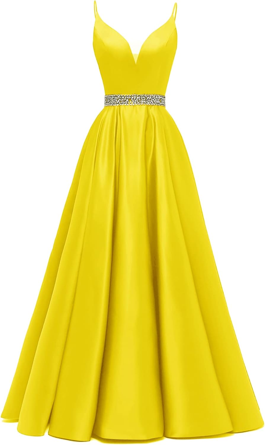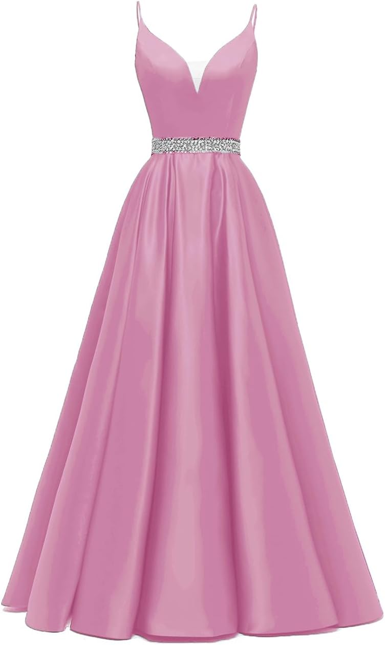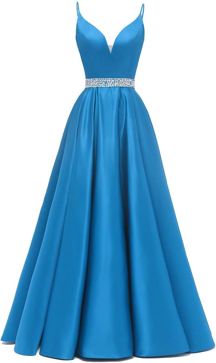 / Spaghetti Straps Prom Dress Long Satin Beaded V-Neck Formal Evening Party Ball Gowns with Pockets