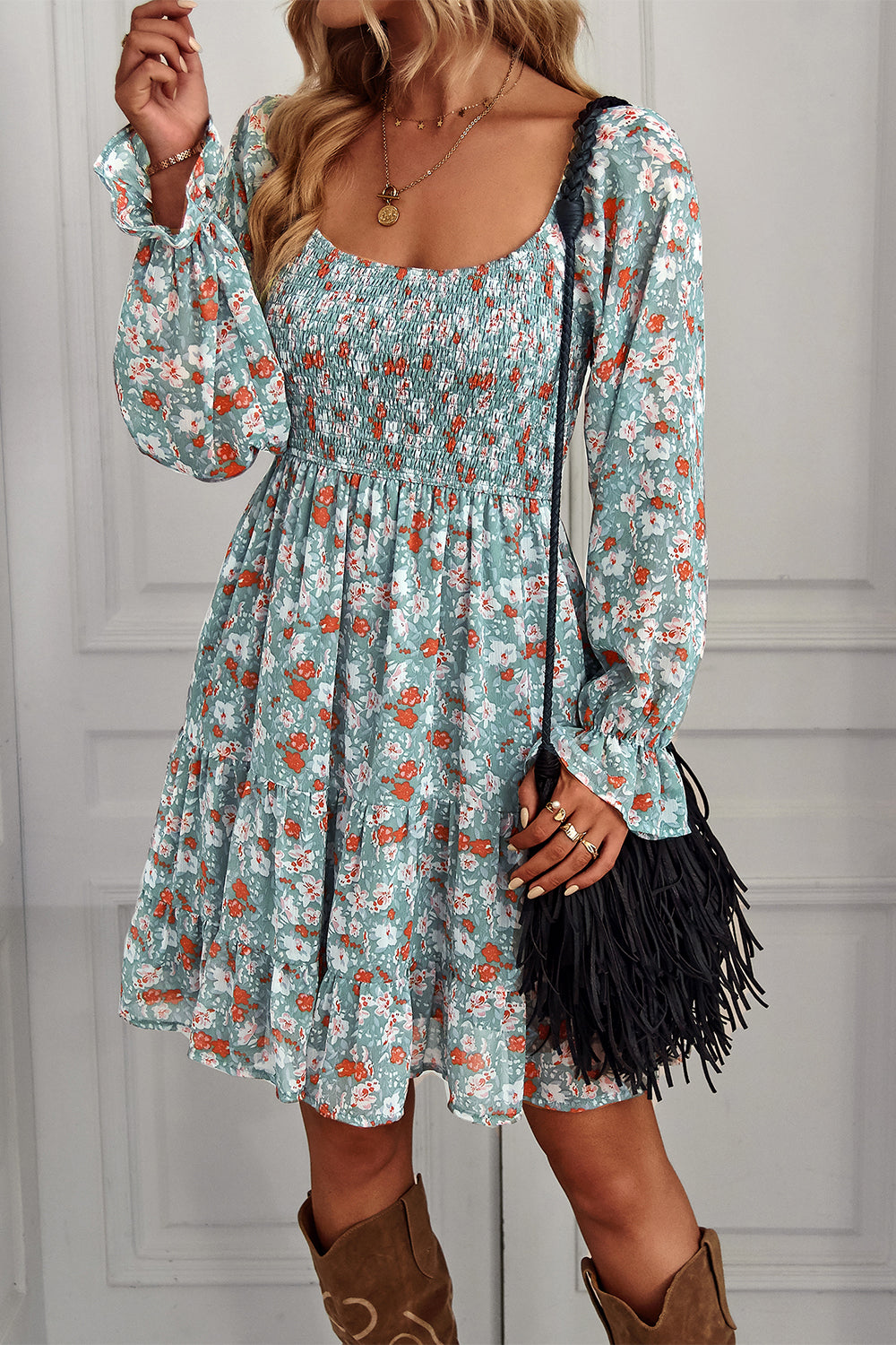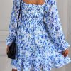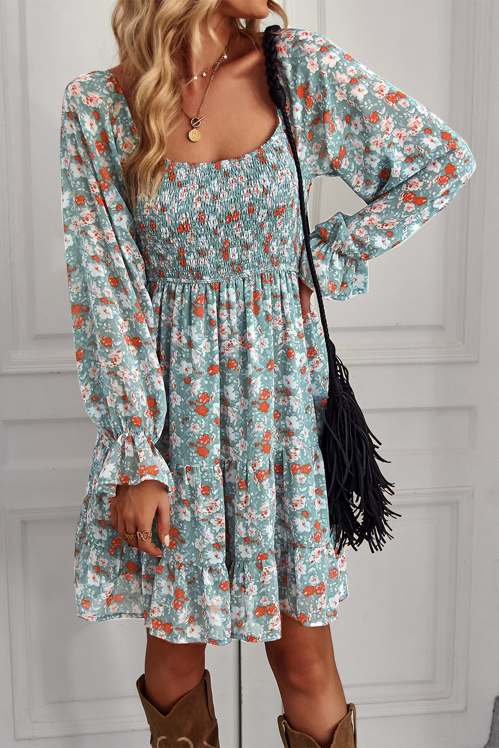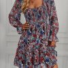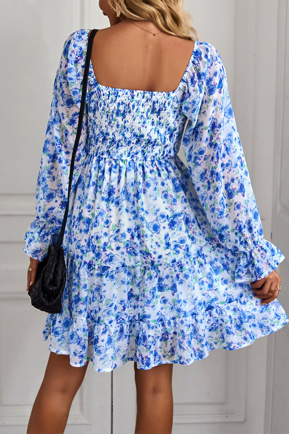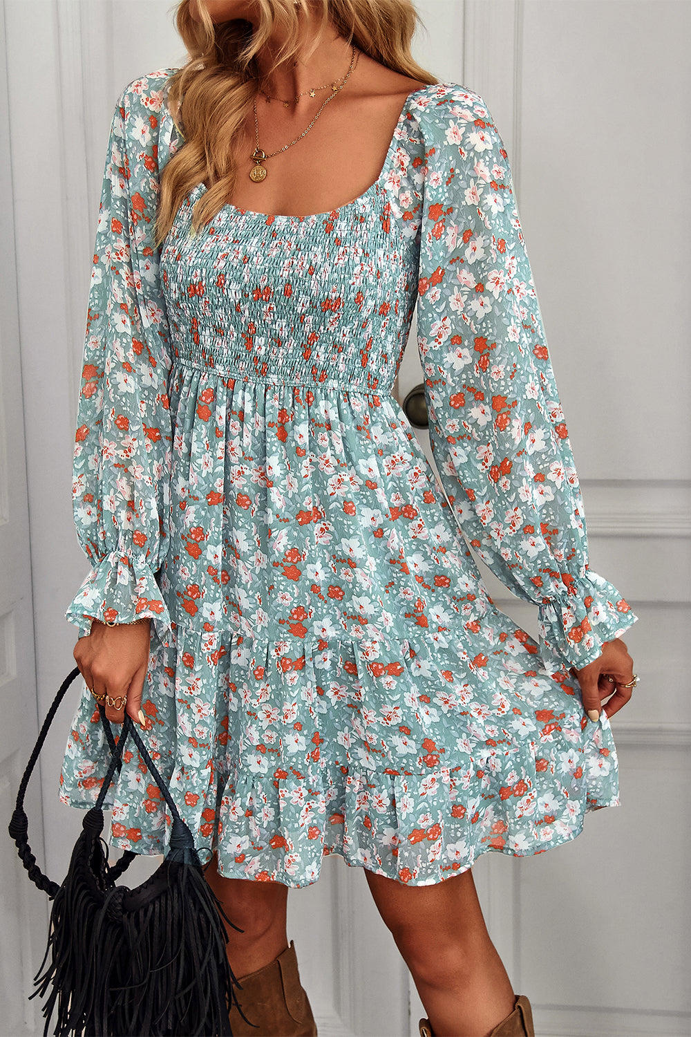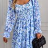 Square Neck Floral Smock Ruffle Long Sleeve Babydoll Dress Mini