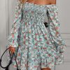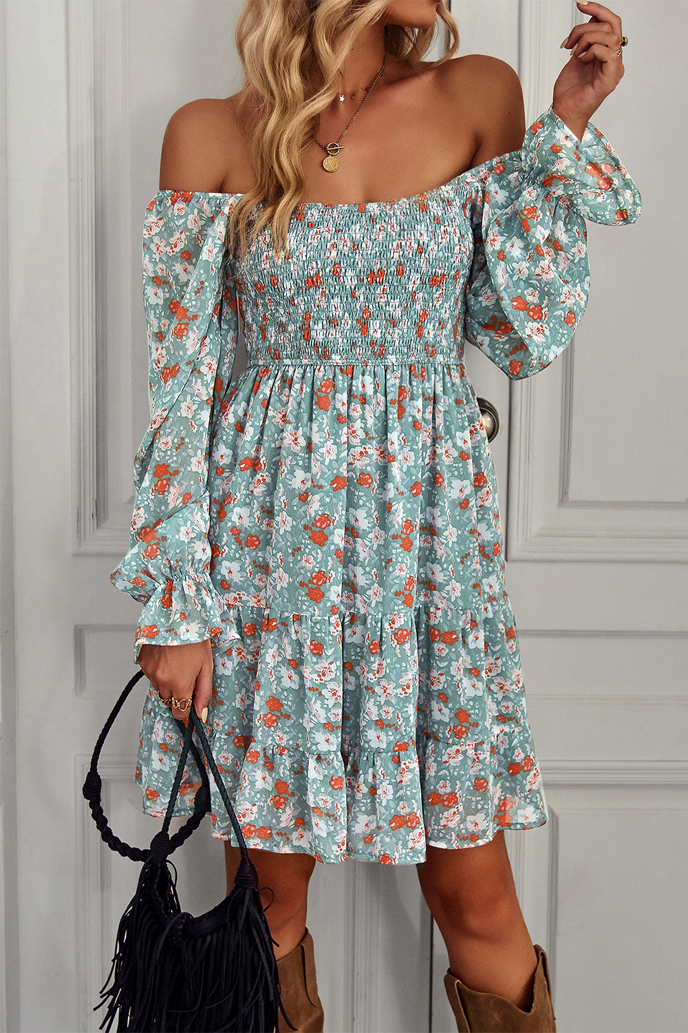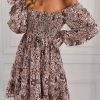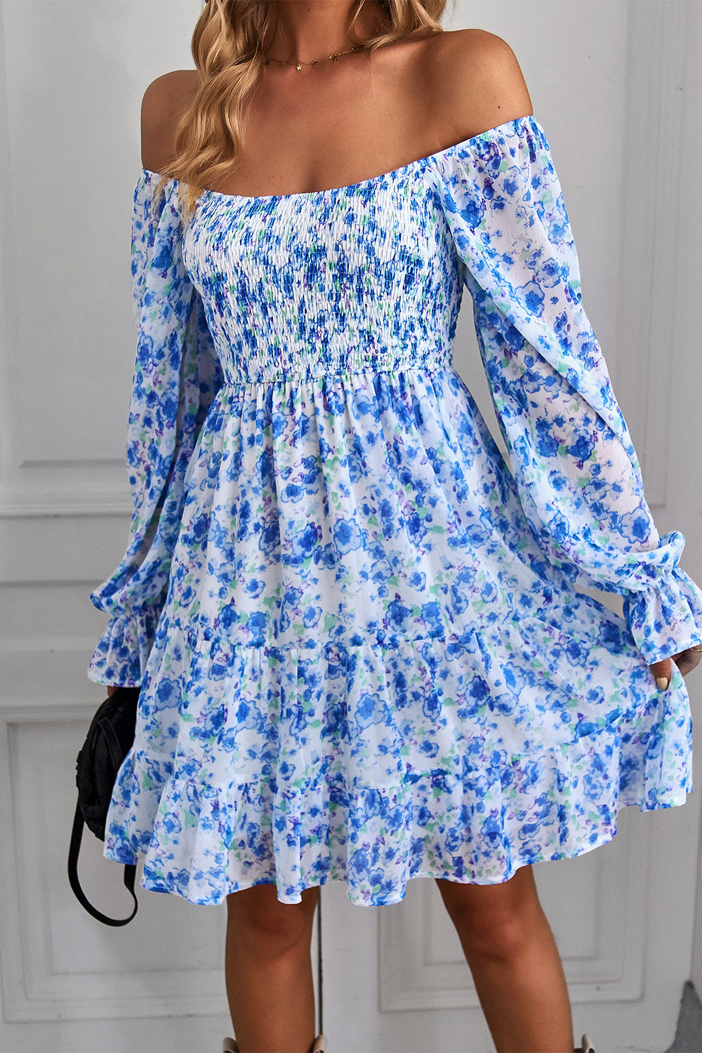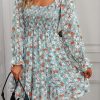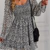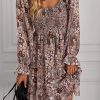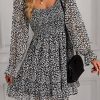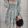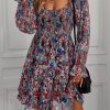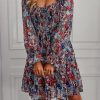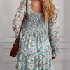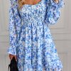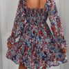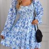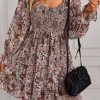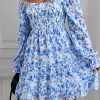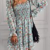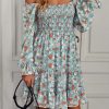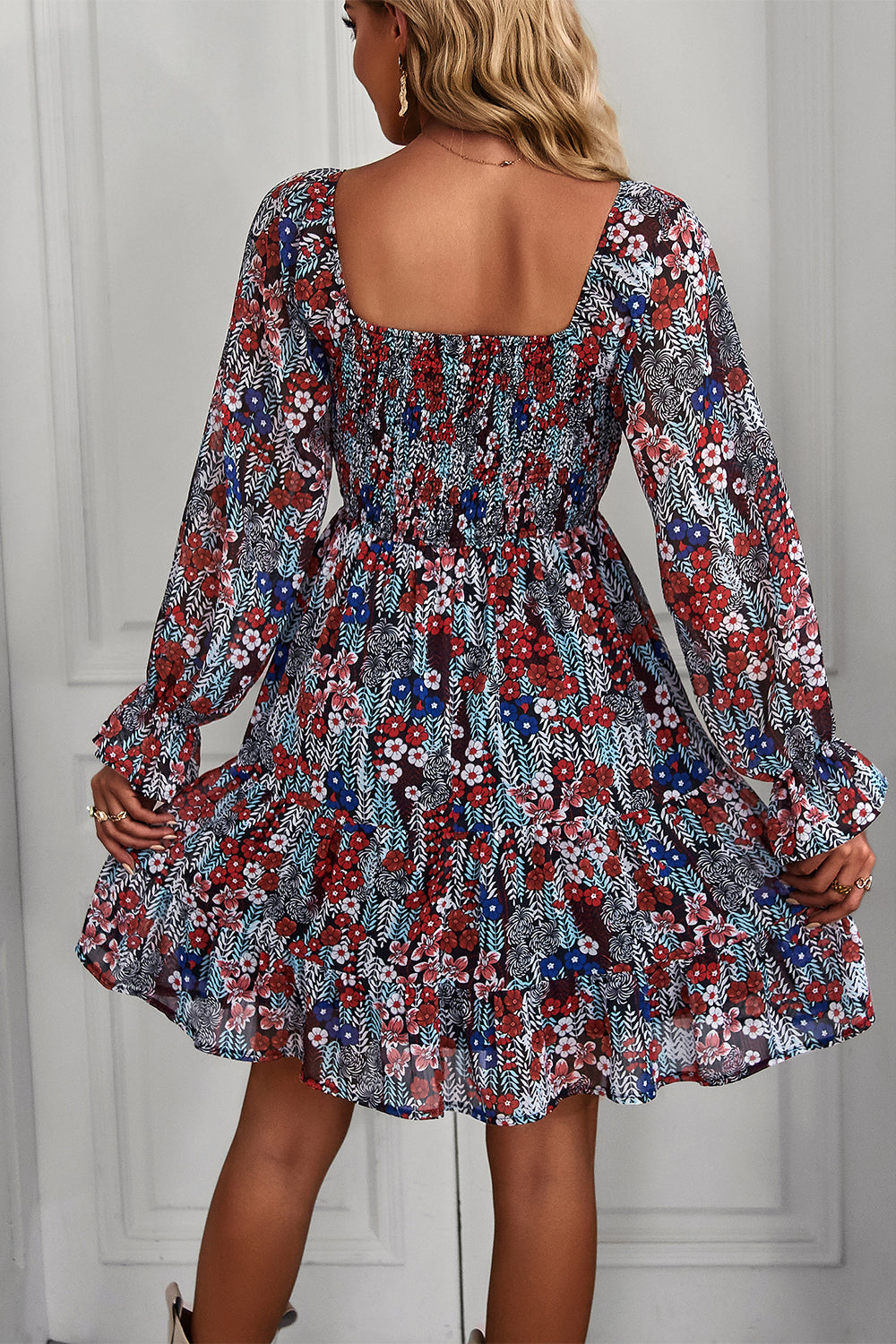 Square Neck Floral Smock Ruffle Long Sleeve Babydoll Dress Mini