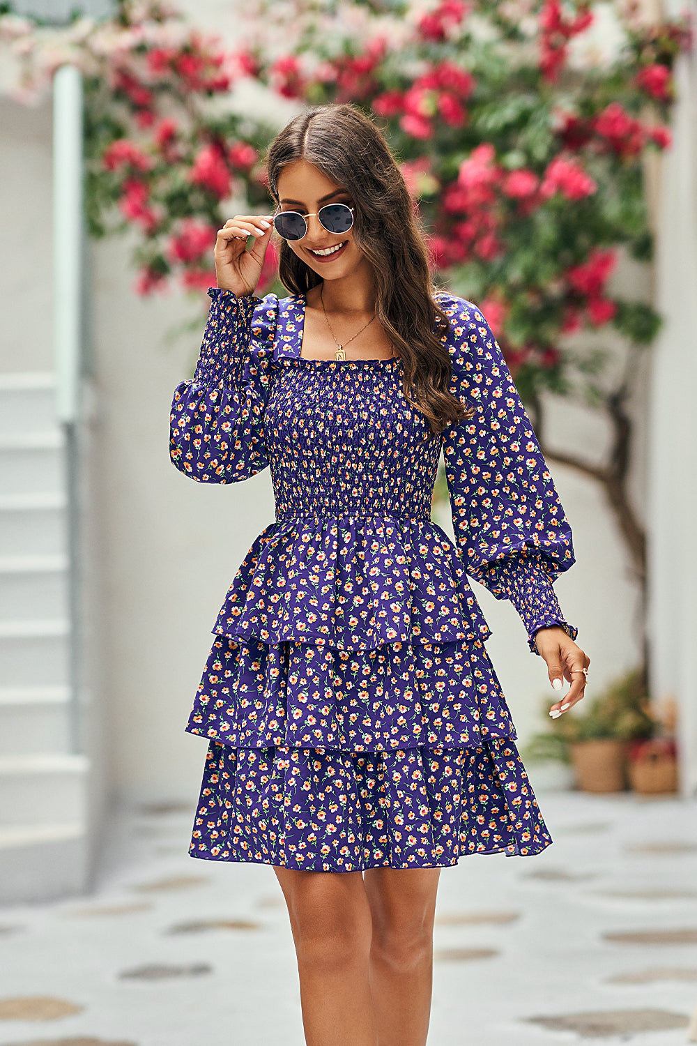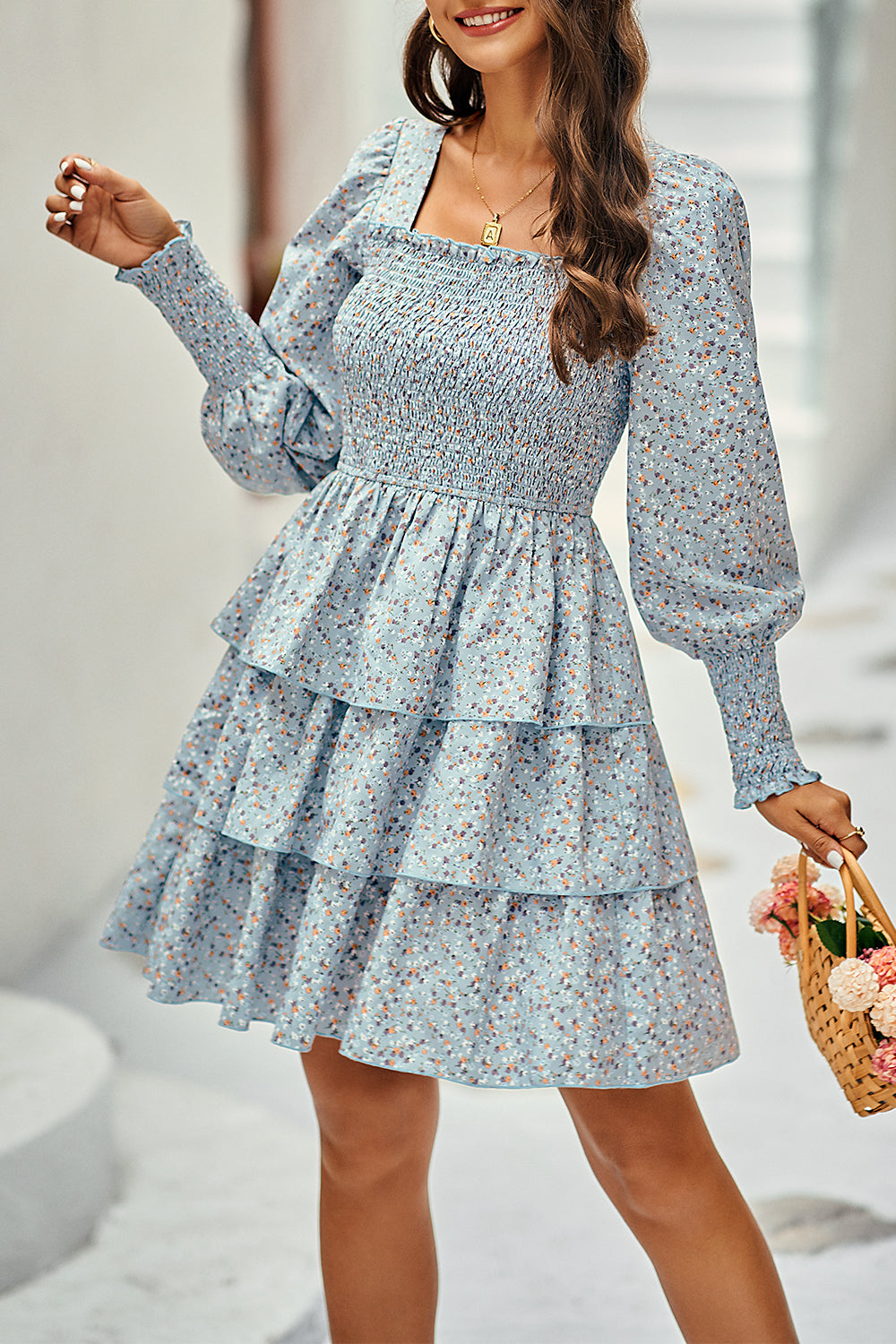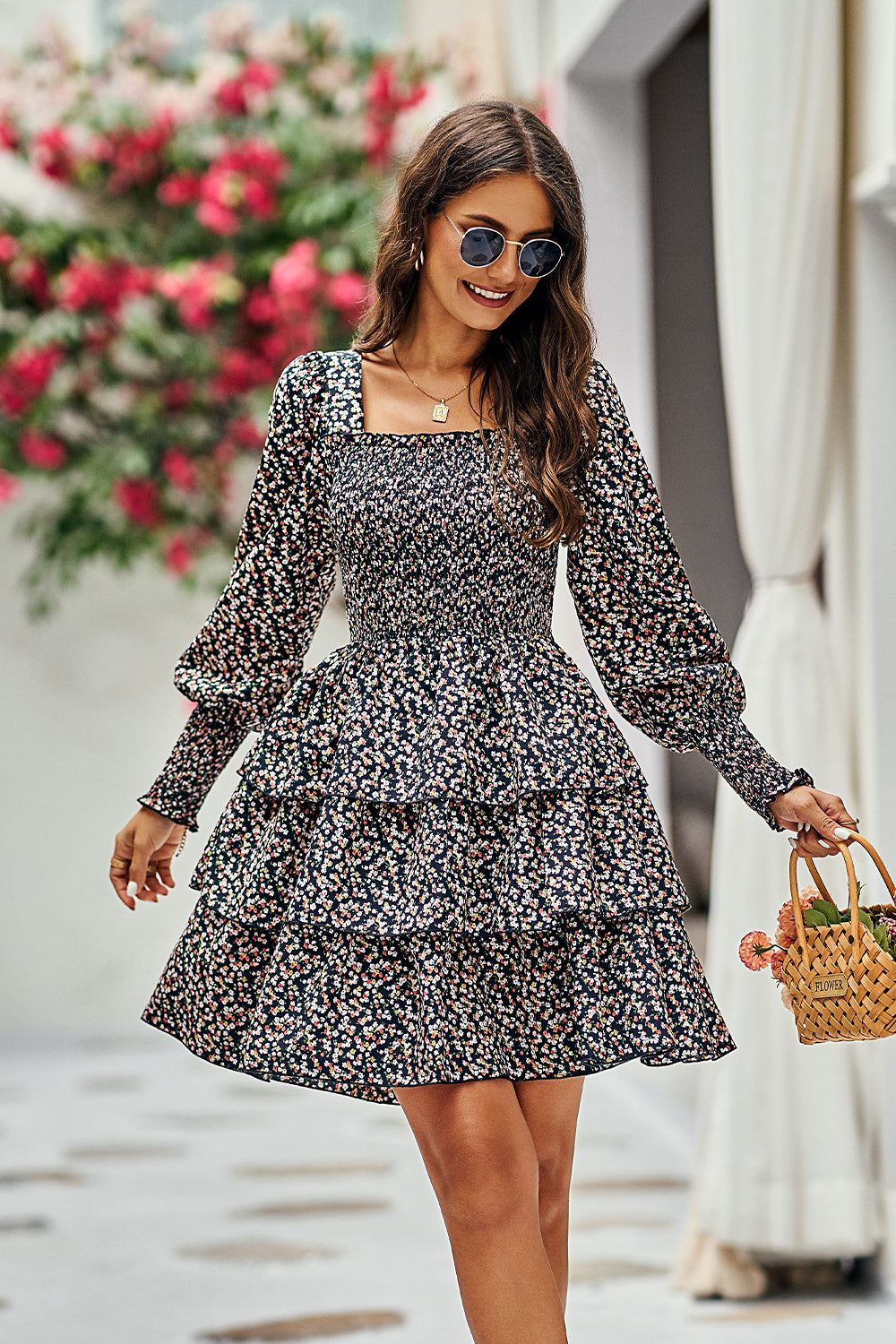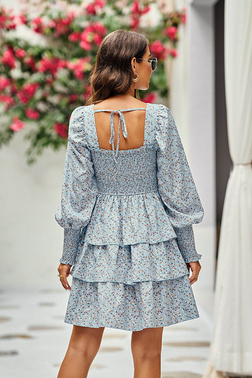 Square Neck Puff Sleeve Flroal Cute Tiered Flowy Dress Mini
