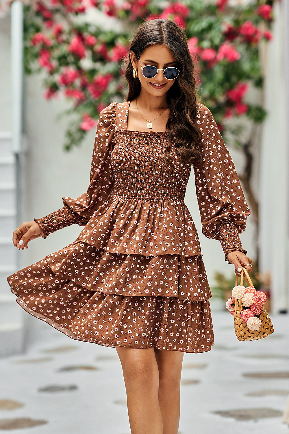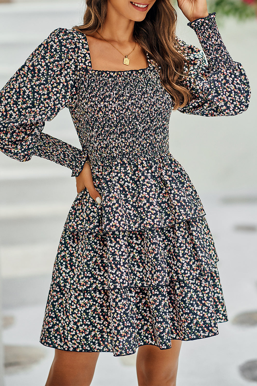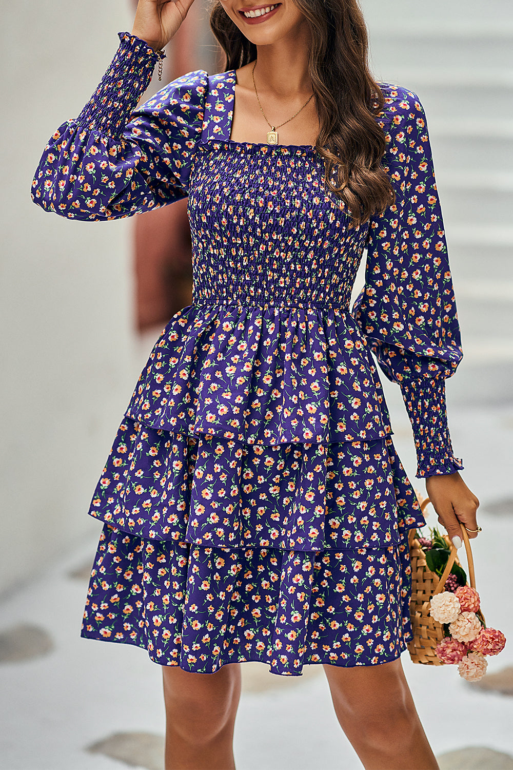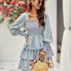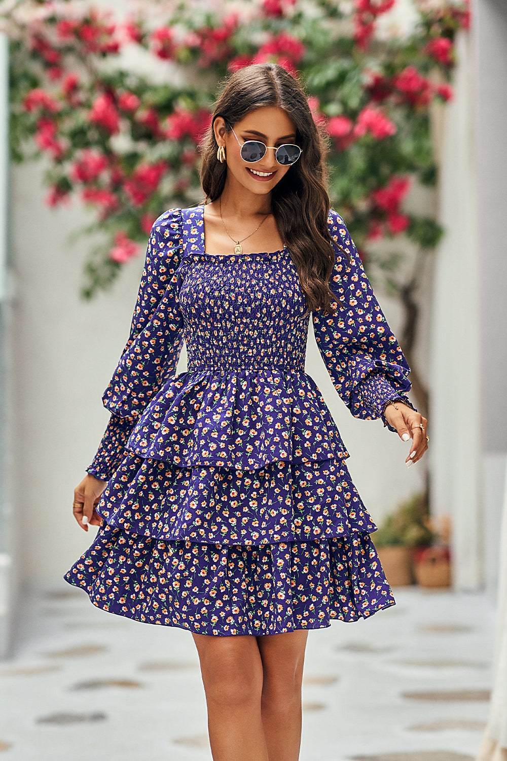 Square Neck Puff Sleeve Flroal Cute Tiered Flowy Dress Mini
