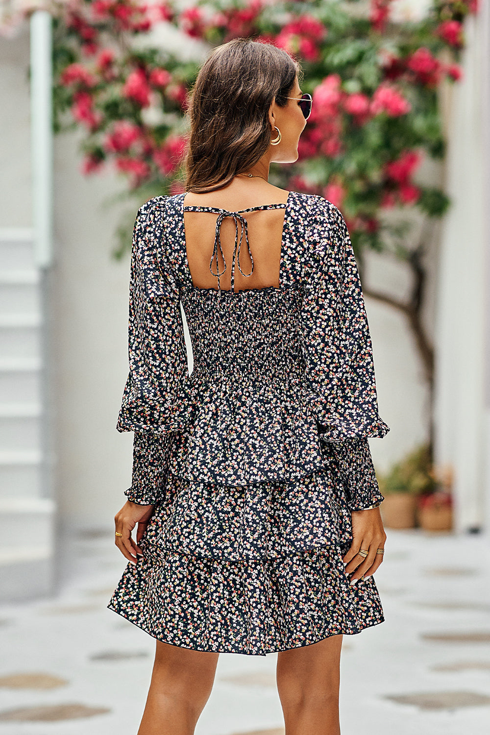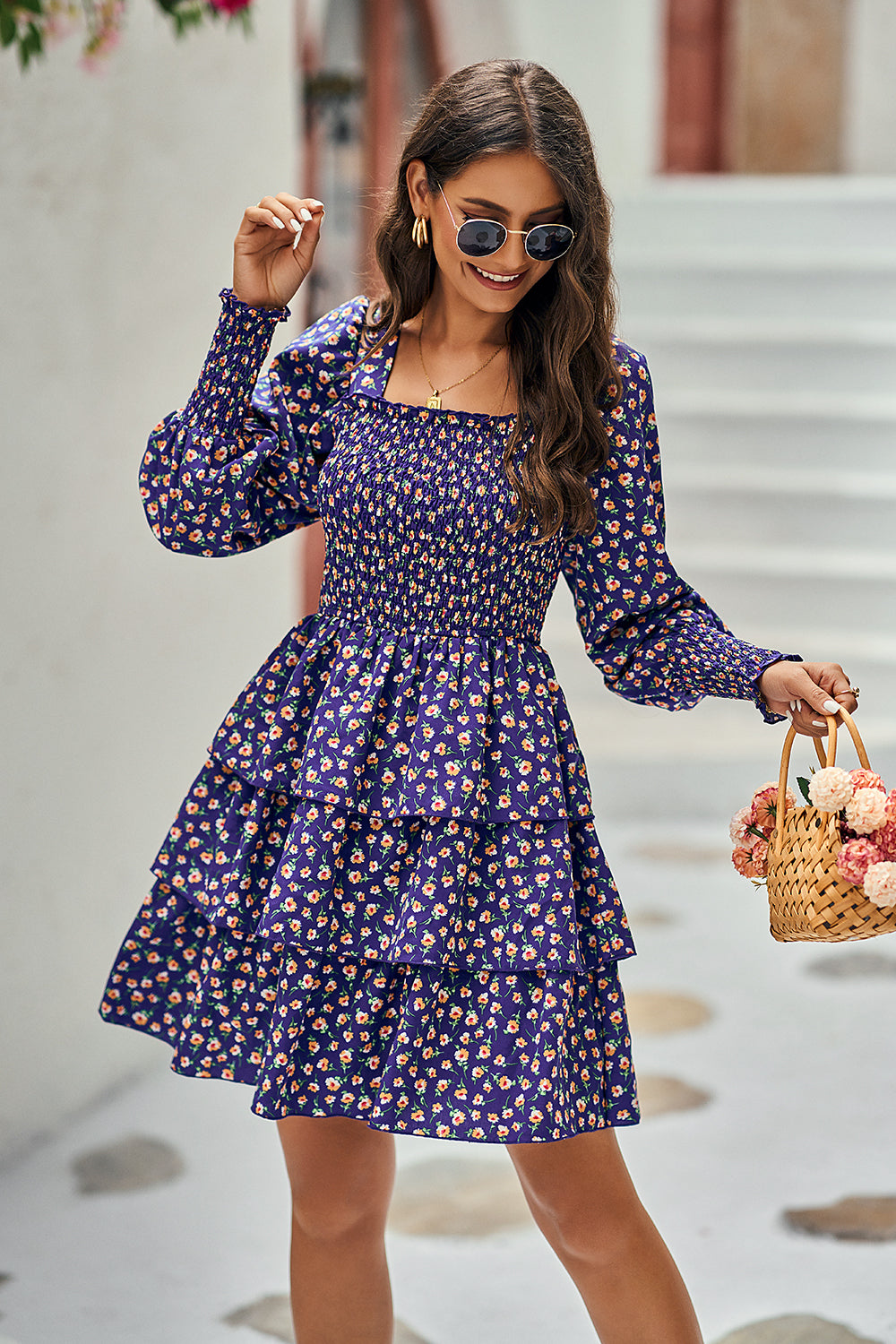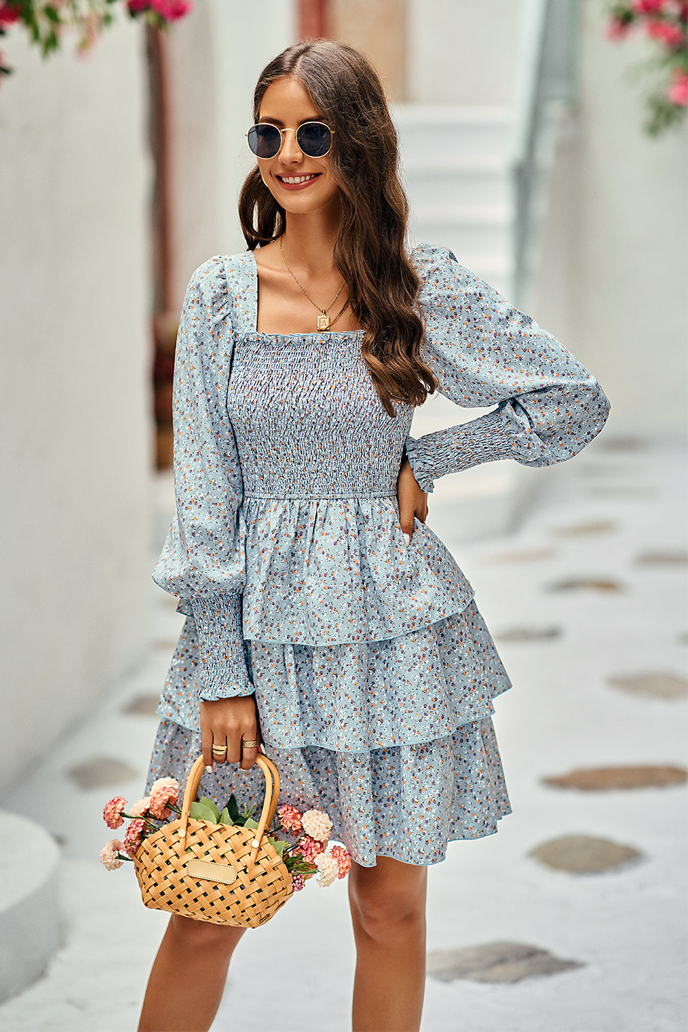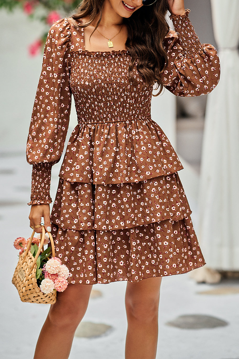 Square Neck Puff Sleeve Flroal Cute Tiered Flowy Dress Mini