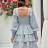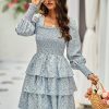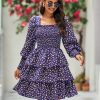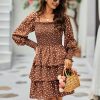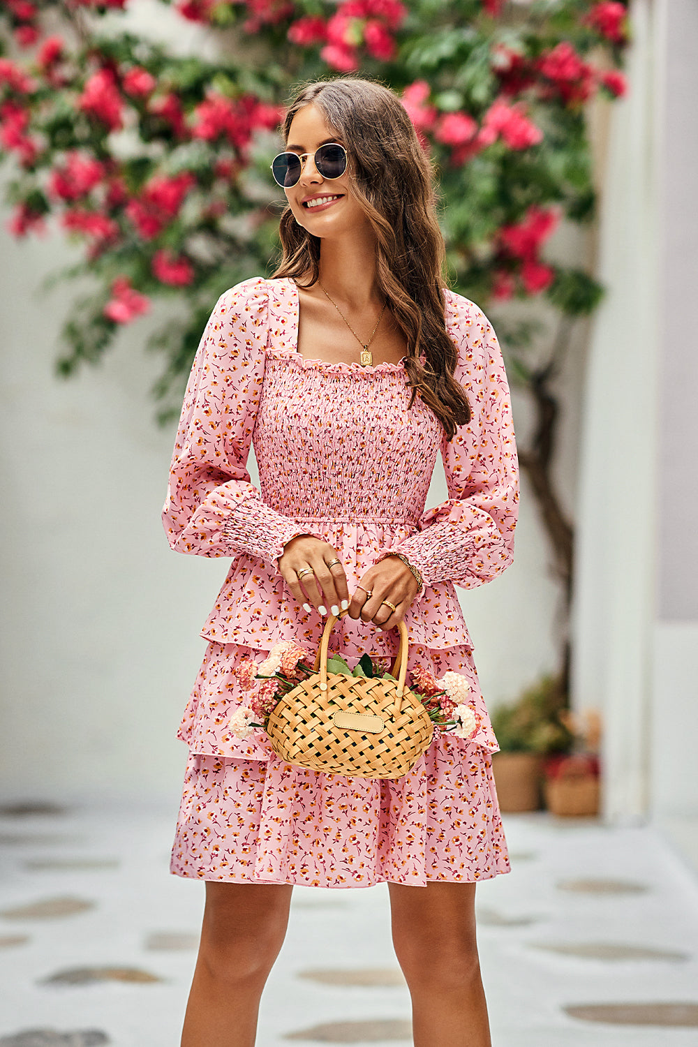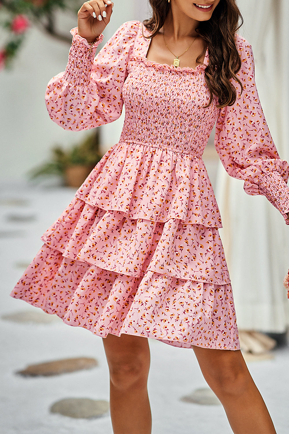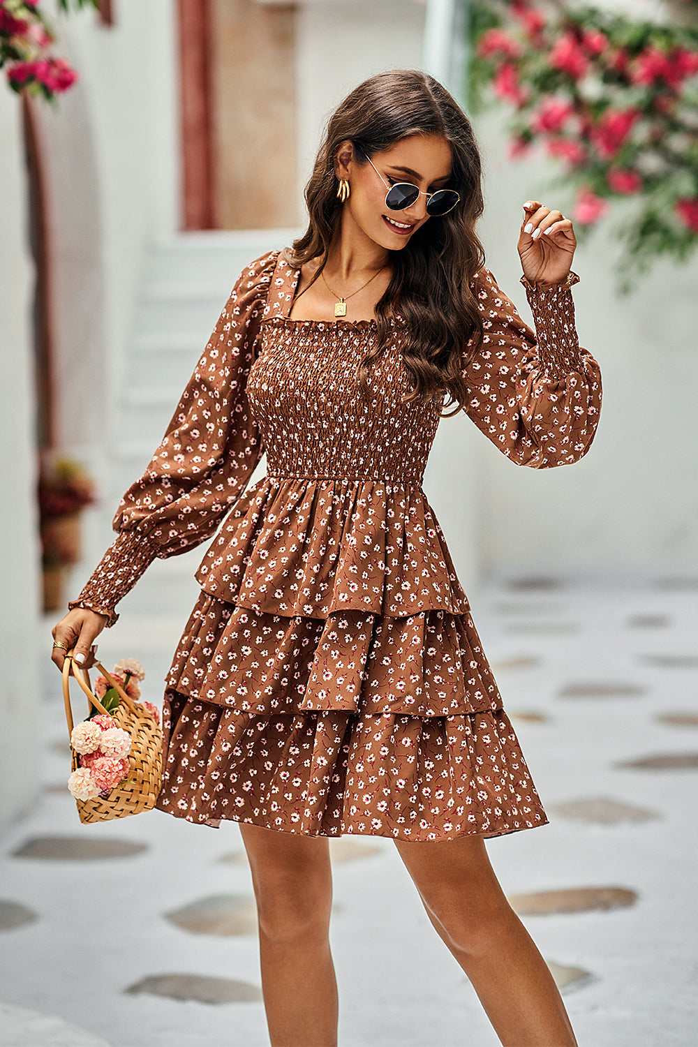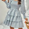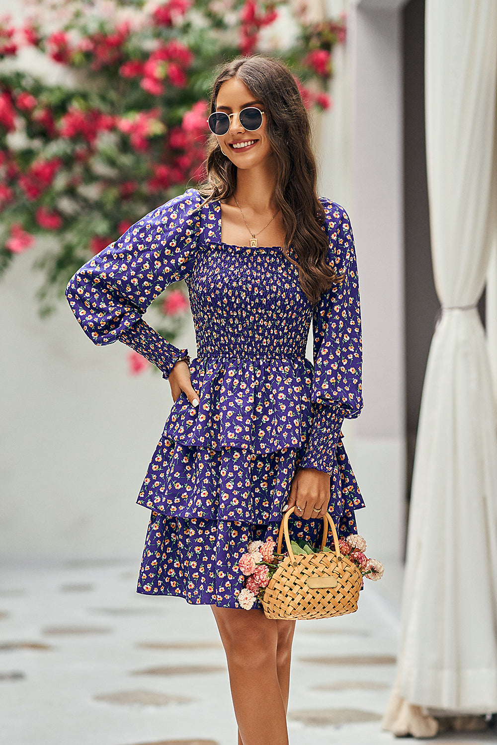 Square Neck Puff Sleeve Flroal Cute Tiered Flowy Dress Mini