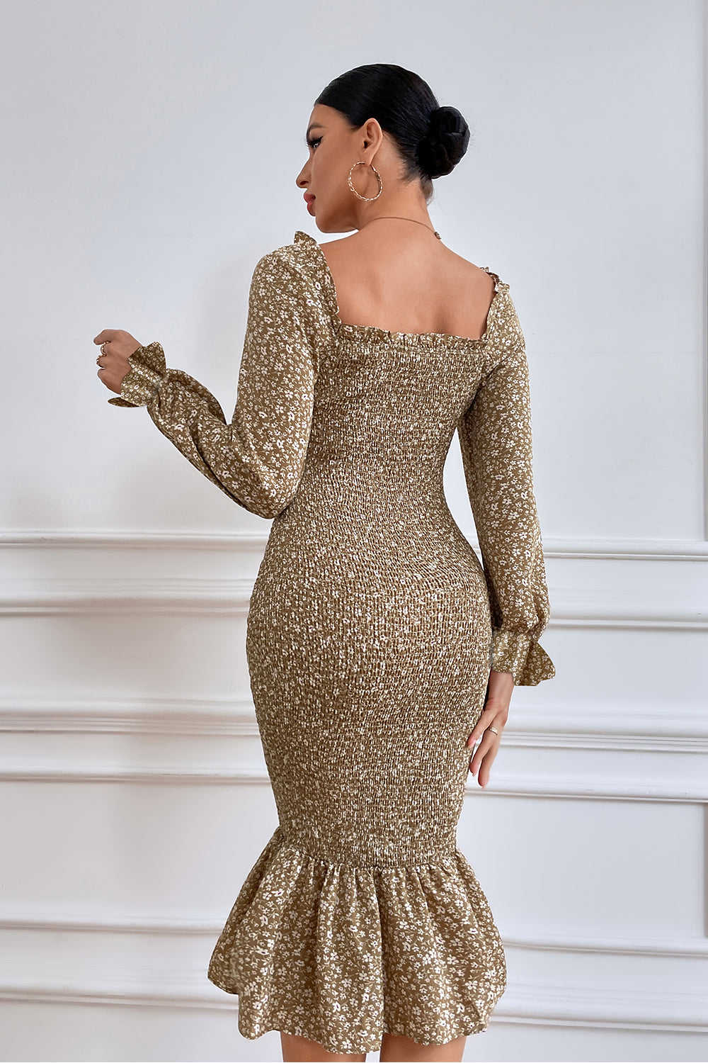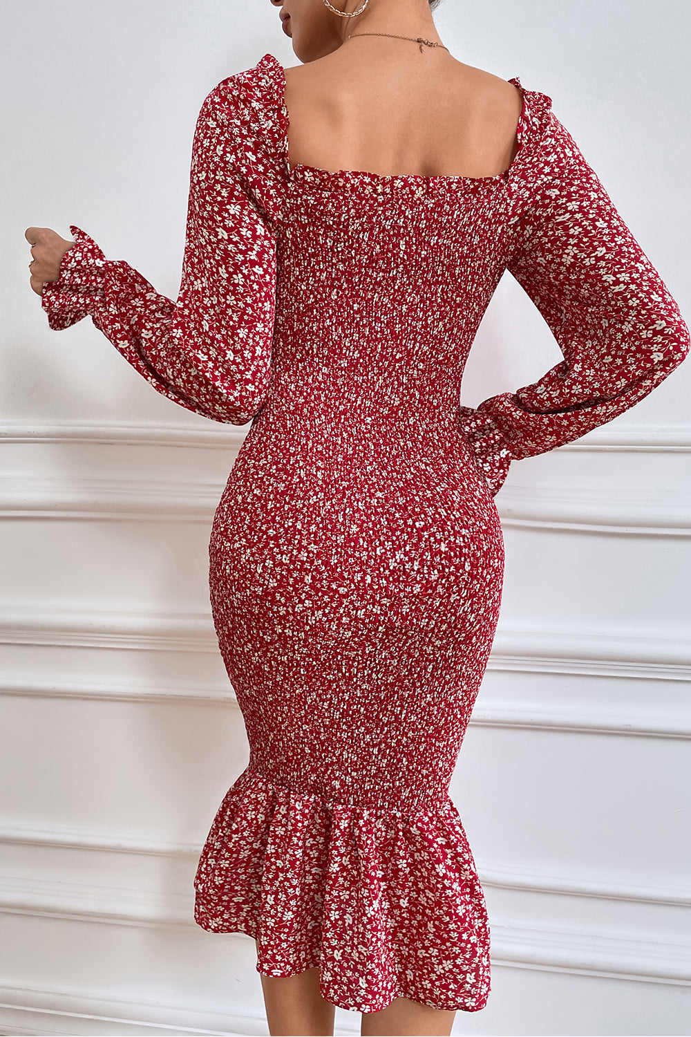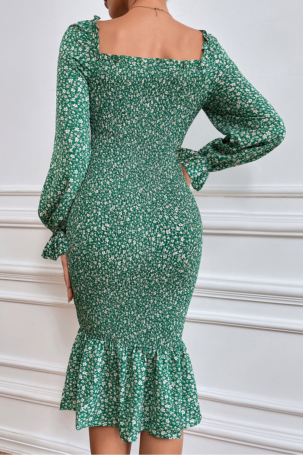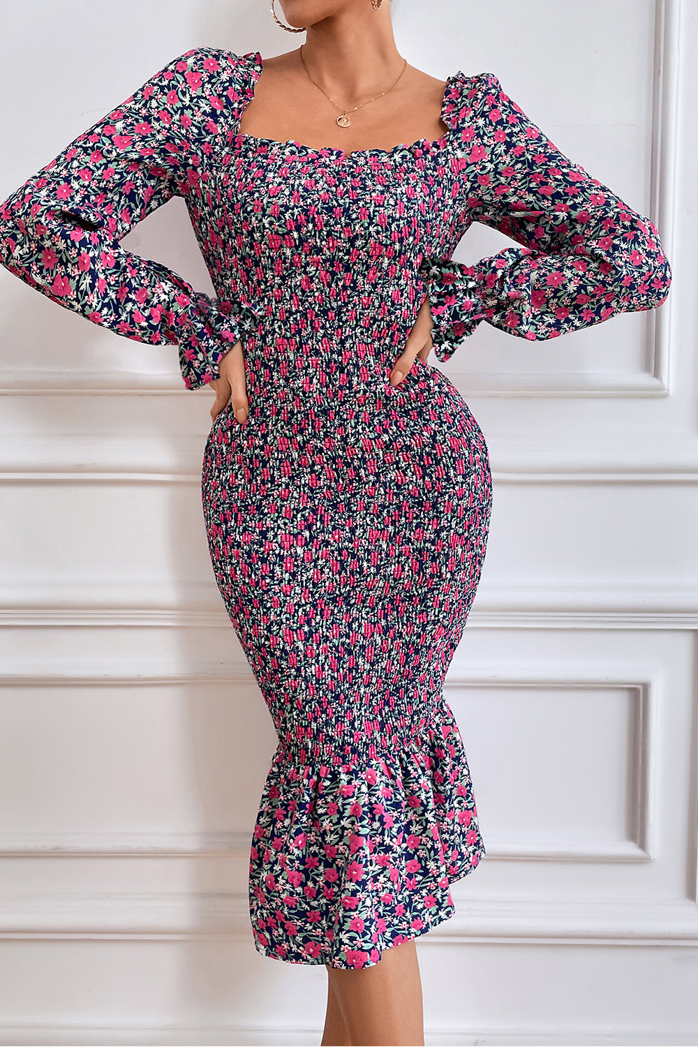 Long Puff Sleeve Floral Midi Bodycon Dress