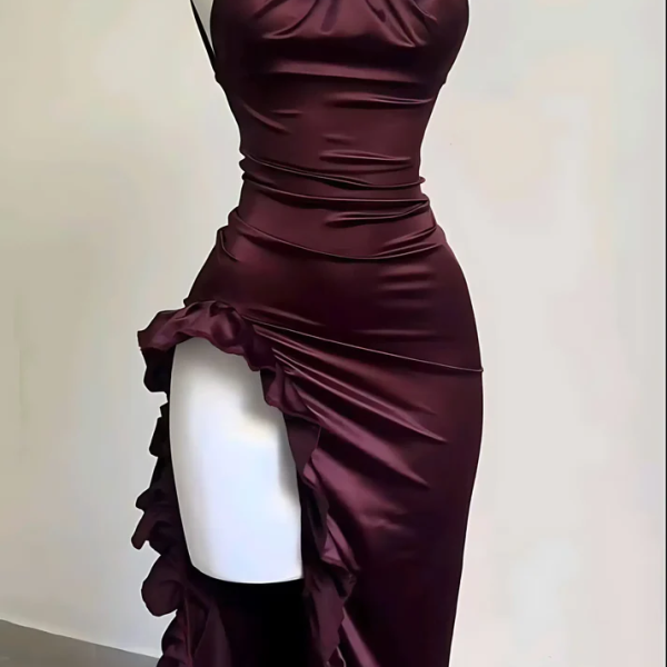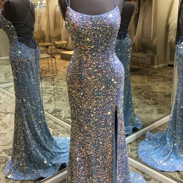 Double Straps Lace-Up Sequins Long Prom Dress with Slit