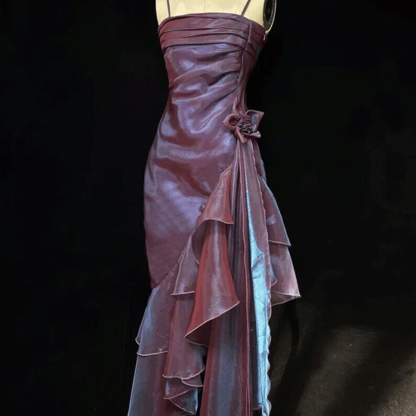 Spaghetti Straps Purple Mermaid Vintage Ruffled Prom Dress